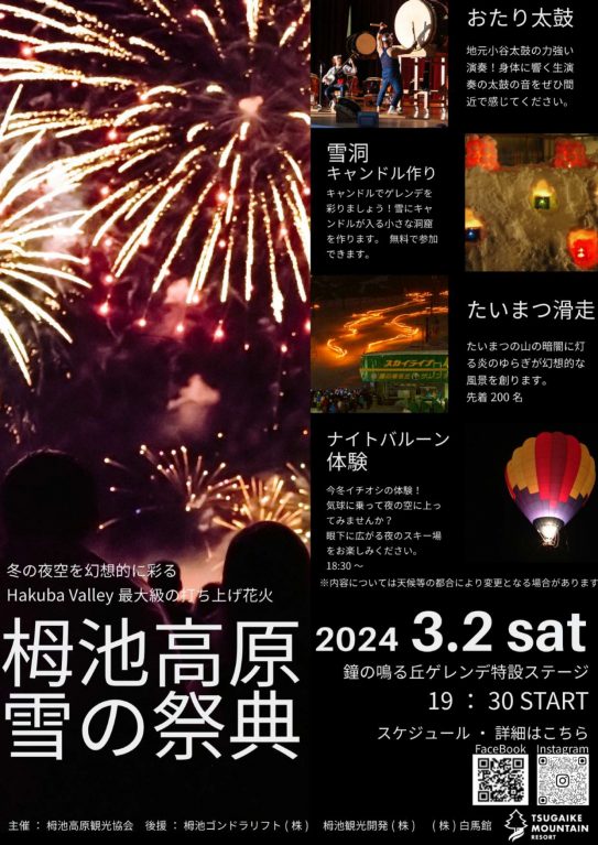 祝い酒の振舞い・信州小谷太鼓の演奏・たいまつ滑走・打ち上げ花火などイベント盛り沢山!!
