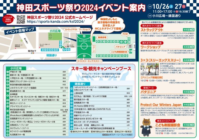 2024/9/28 12:21 10/26(土)、10/27(日)今年も会いに行きます!「神田スポーツ祭り」でお会いしましょう! 今年も、イベント「神田スポーツ祭り」出展決定しました! リフト1日券が当たる大抽選会やお得な前売券販売も行いますので是非ブースに会いに来てください。 お待ちしております! ◆開催日:2024年10月26日(土)、27日(日) 2日間 ◆ブース場所:靖国通り20番 ◆早割券販売料金: ▼神田スポーツ祭りに関する詳しくは → こちら