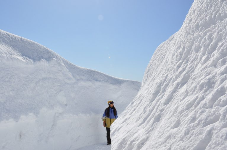 標高1,500m付近エリアの雪山を切り拓いて出現した雪壁は、長い冬の間、降り積もった豊富な積雪量を誇る栂池ならではの絶景ポイント。