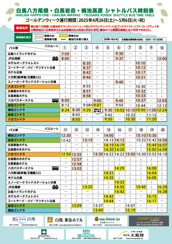 2025/4/20 10:20 ゴールデンウィーク「八方尾根⇔白馬岩岳⇔栂池高原」無料シャトルバスのご案内! まだまだ滑れるゴールデンウィーク!シャトルバス運行も行いますので是非、ご利用くださいませ。 ◆乗車条件:白馬八方、白馬岩岳、栂池高原のゴンドラ・リフト・ロープウェイをバスご乗車当日に利用するお客様のみ乗車可能 ◆運行期間:2025年5月31日(土)~11月3日(月・祝) 時刻表は(PDF) →こちら
