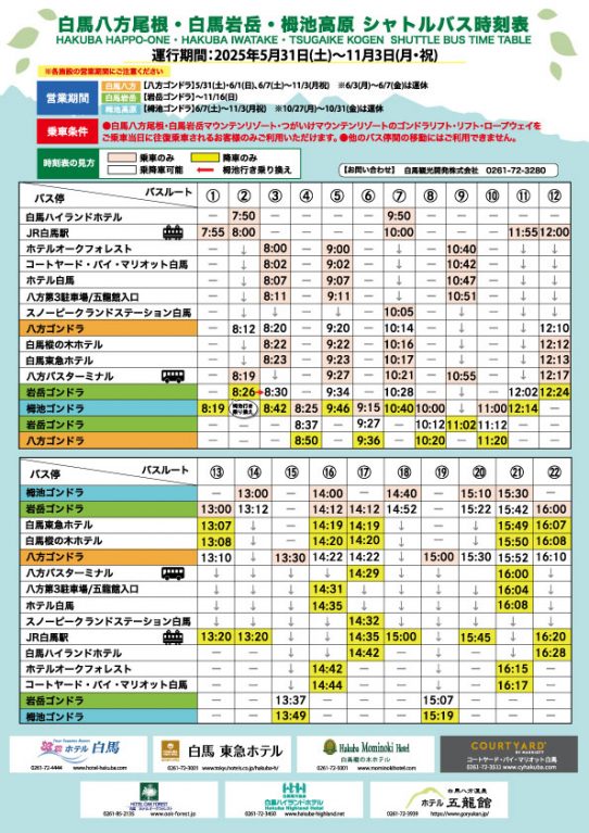 2025/5/29 10:34 グリーンシーズン「八方尾根⇔白馬岩岳⇔栂池高原」無料シャトルバスのご案内! 白馬八方⇔白馬岩岳⇔栂池高原を周遊するシャトルバス運行も行いますので是非、ご利用くださいませ。 ◆乗車条件:白馬八方、白馬岩岳、栂池高原のゴンドラ・リフト・ロープウェイをバスご乗車当日に利用するお客様のみ乗車可能 ◆運行期間:2025年5月31日(土)~11月3日(月・祝) 時刻表は(PDF) →こちら