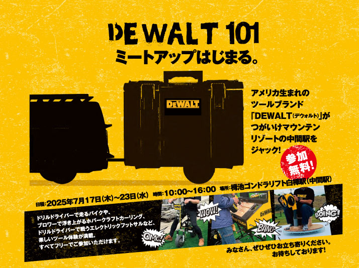 DEWALT 101とは、101年目の2025年、100周年のレイモンド号にカーゴをプラス(+1)することで、改めて初心に戻り、DEWALTをさらに知っていただく機会を作り、1からしっかりと、DEWALTを深く学び、コミュニティを築き上げていくプロジェクトで、つがいけマウンテンリゾートで気軽に交流し、情報交換を行いながら1から学ぶ体験が可能です。
