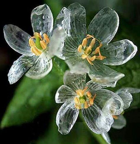 【雨に濡れているサンカヨウ】花びらが透明になり、まるでガラス細工のよう