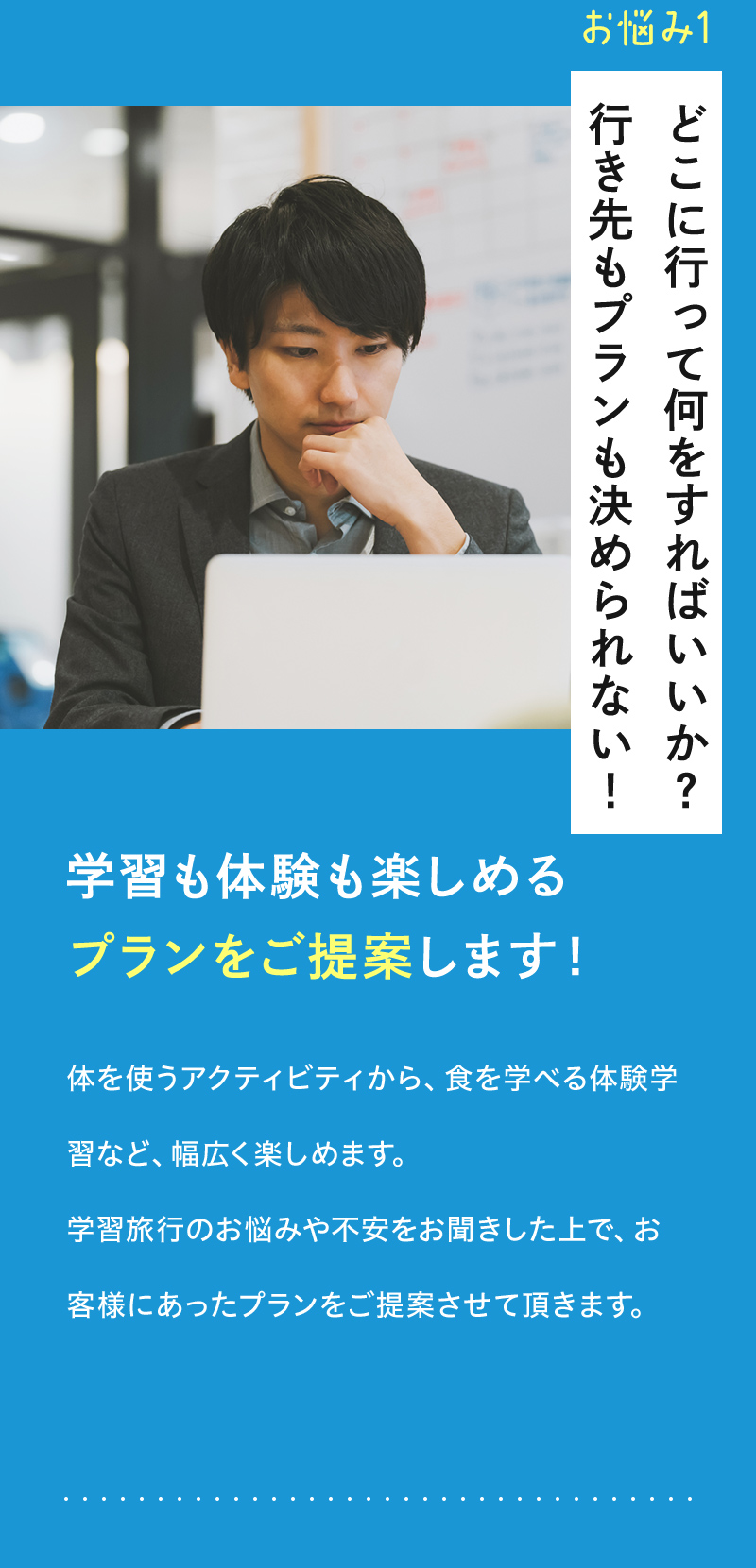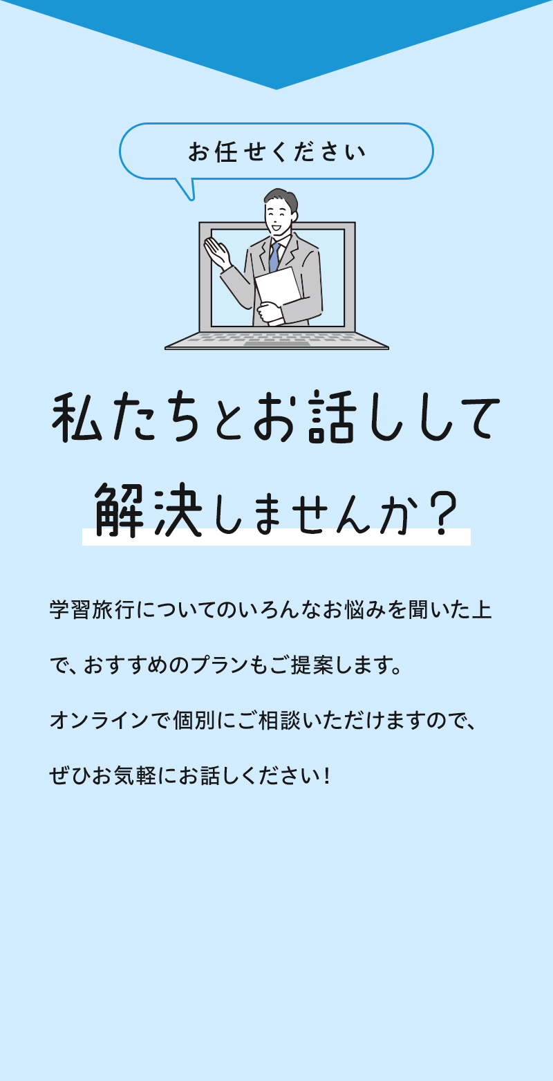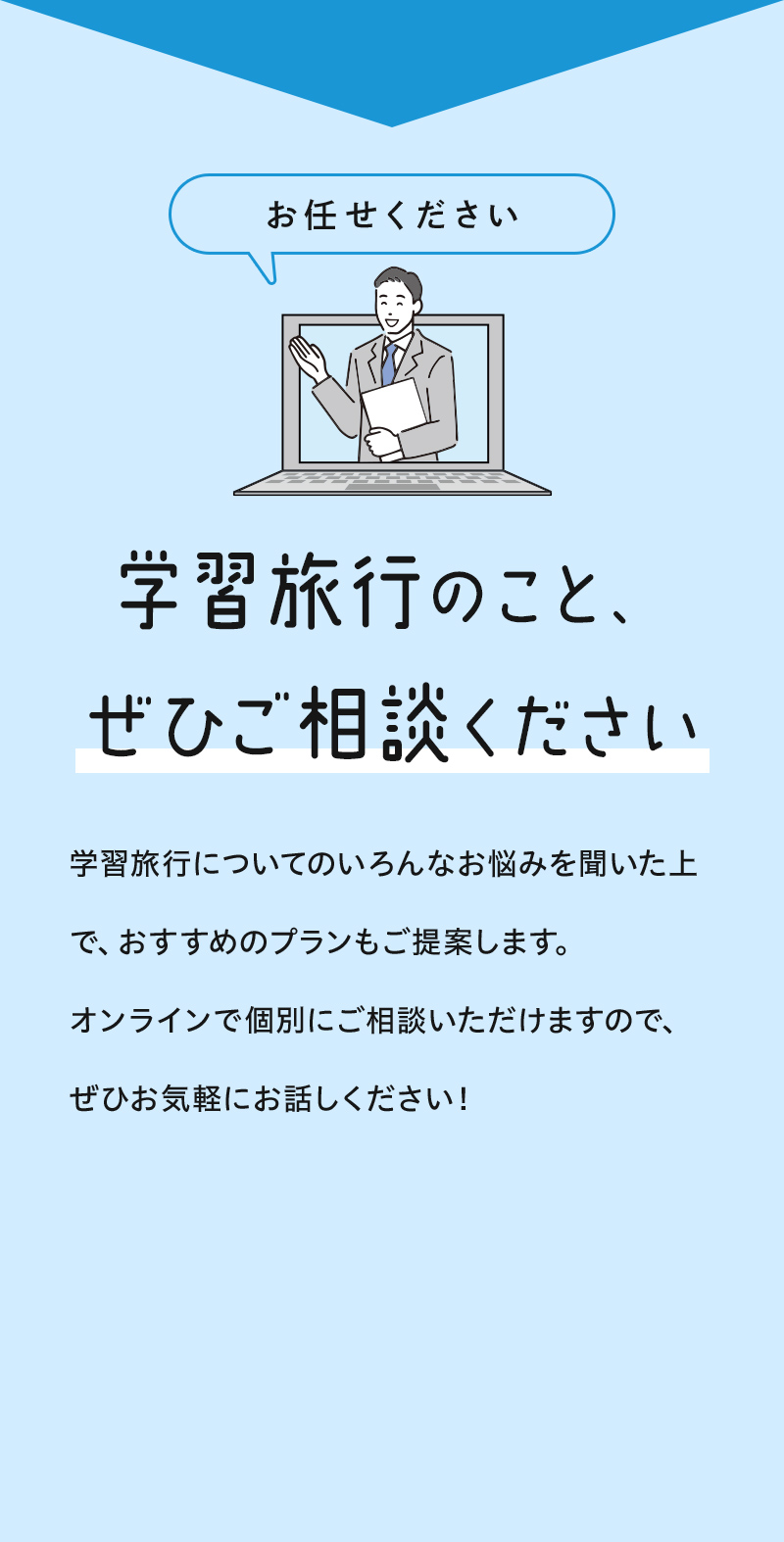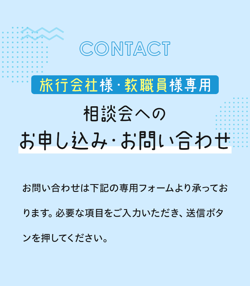 お問い合わせ内容 相談会のご予約その他、学習旅行に関するご相談 相談会の参加方法 お電話オンライン 来場希望日 ※当日・前日のご参加に関しましては、お電話にてご相談ください。 第1希望日 時間を選択してください10時〜11時〜12時〜13時〜14時〜 第2希望日 時間を選択してください10時〜11時〜12時〜13時〜14時〜 会社名・学校名 お名前 メールアドレス お電話番号 その他、ご質問など 個人情報保護方針に同意する
